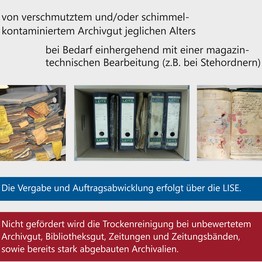 - Massenentsäuerung: Unterstützung beim Transport von Archivalien zur Entsäuerung außerhalb der Landesinitiative Substanzerhalt (PDF, nicht barrierefrei)